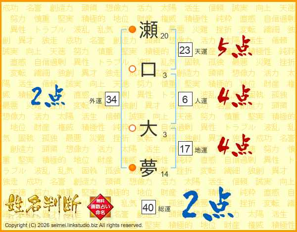 瀬(20画)口(3画) 大(3画)夢(14画)