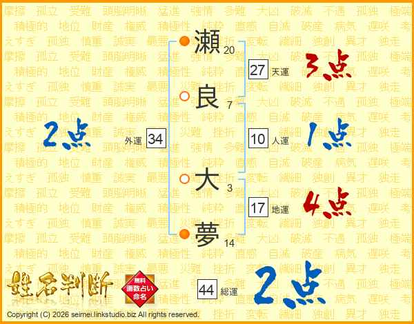 瀬(20画)良(7画) 大(3画)夢(14画)