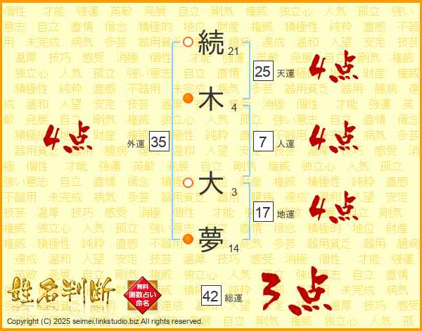 あなたの人生を表す1番重要な運勢です。生涯を通じて影響する総合運となり、主に50歳以降の晩年期に影響を及ぼします。苗字と名前の合計画数。