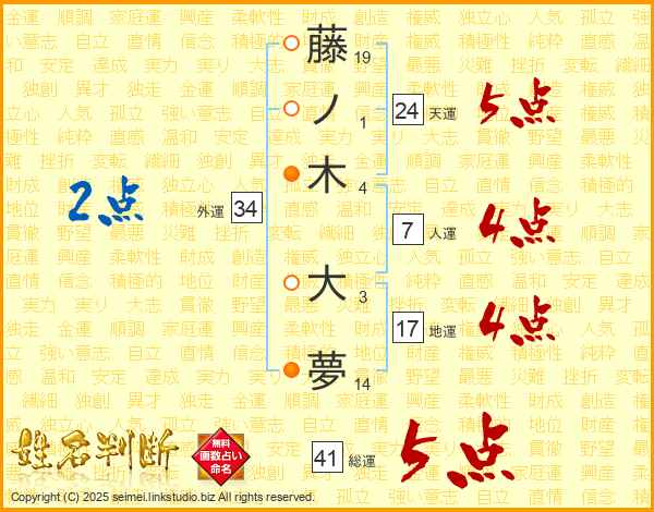 藤(19画)ノ(1画)木(4画) 大(3画)夢(14画)