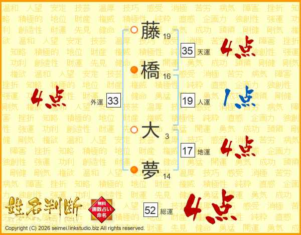 藤橋大夢さんの総運は52画の4点!