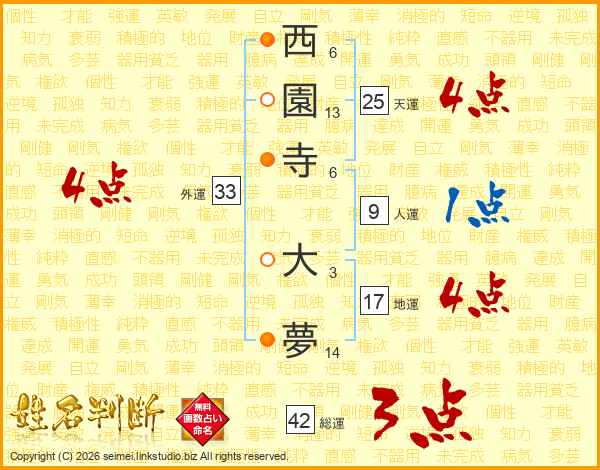 西(6画)園(13画)寺(6画) 大(3画)夢(14画)