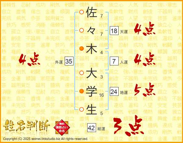 佐(7画)々(7画)木(4画) 大(3画)学(16画)生(5画)