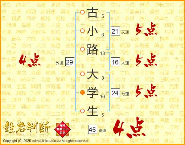 あなたの人生を表す1番重要な運勢です。生涯を通じて影響する総合運となり、主に50歳以降の晩年期に影響を及ぼします。苗字と名前の合計画数。