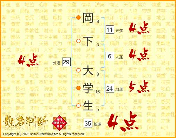 岡下大学生さんの総運は35画の4点!