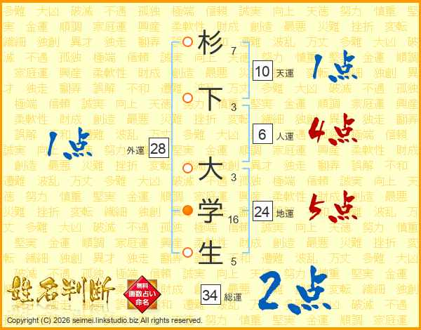 杉(7画)下(3画) 大(3画)学(16画)生(5画)