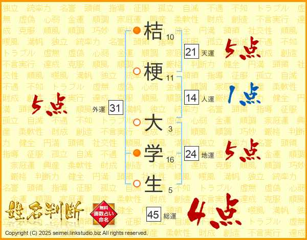 桔(10画)梗(11画) 大(3画)学(16画)生(5画)