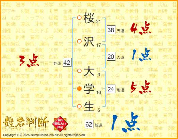 桜(21画)沢(17画) 大(3画)学(16画)生(5画)