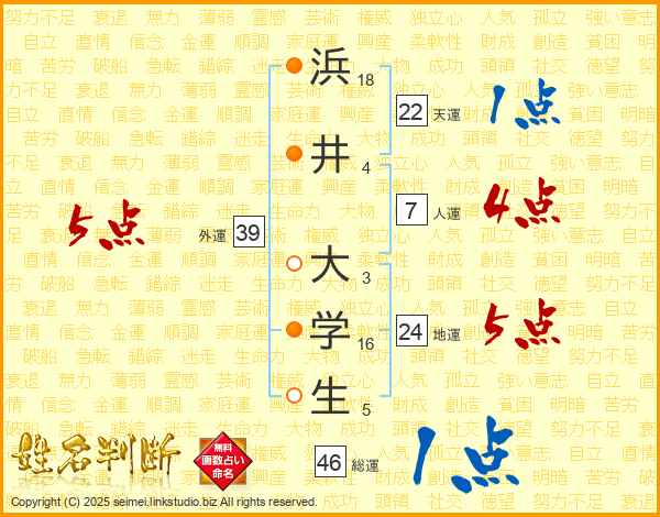 浜(18画)井(4画) 大(3画)学(16画)生(5画)
