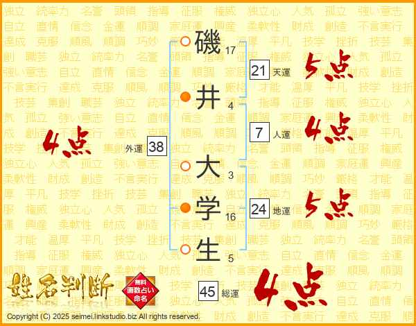 磯井大学生さんの総運は45画の4点!