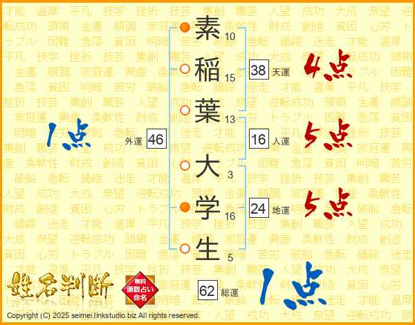 素稲葉大学生さんの総運は62画の1点!