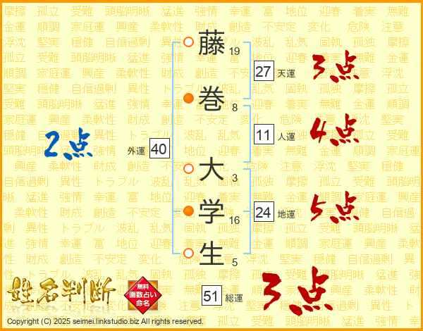 藤(19画)巻(8画) 大(3画)学(16画)生(5画)