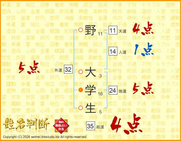 生活面を象徴する運勢です。外部から受ける影響力を表し、結婚運、家庭運や職場、環境への順応性を表します。総運から人運を引いた画数。姓や名が1文字の場合を除く。