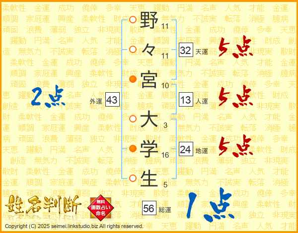 野(11画)々(11画)宮(10画) 大(3画)学(16画)生(5画)