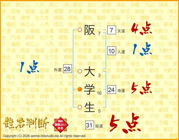 生活面を象徴する運勢です。外部から受ける影響力を表し、結婚運、家庭運や職場、環境への順応性を表します。総運から人運を引いた画数。姓や名が1文字の場合を除く。