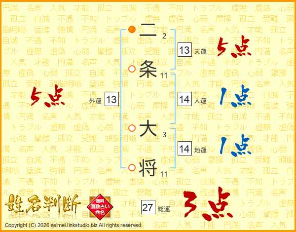 二条大将さんの総運は27画の3点!