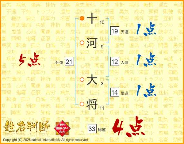 あなたの人生を表す1番重要な運勢です。生涯を通じて影響する総合運となり、主に50歳以降の晩年期に影響を及ぼします。苗字と名前の合計画数。