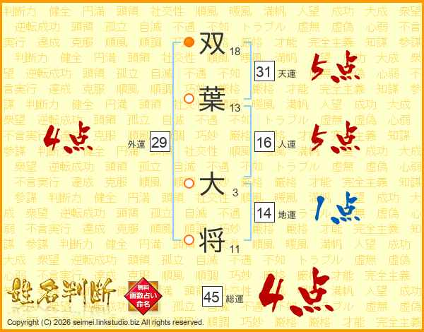 あなたの人生を表す1番重要な運勢です。生涯を通じて影響する総合運となり、主に50歳以降の晩年期に影響を及ぼします。苗字と名前の合計画数。