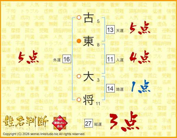 生活面を象徴する運勢です。外部から受ける影響力を表し、結婚運、家庭運や職場、環境への順応性を表します。総運から人運を引いた画数。姓や名が1文字の場合を除く。