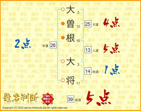大(3画)曽(12画)根(10画) 大(3画)将(11画)