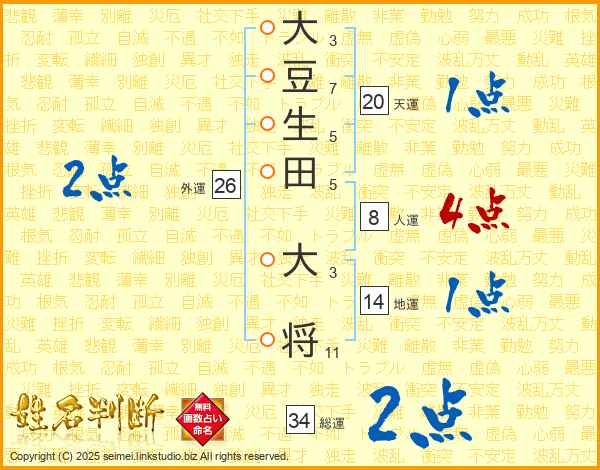 大(3画)豆(7画)生(5画)田(5画) 大(3画)将(11画)