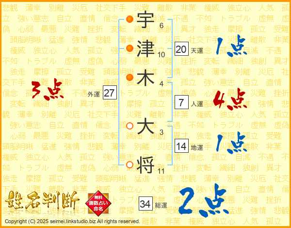 宇(6画)津(10画)木(4画) 大(3画)将(11画)