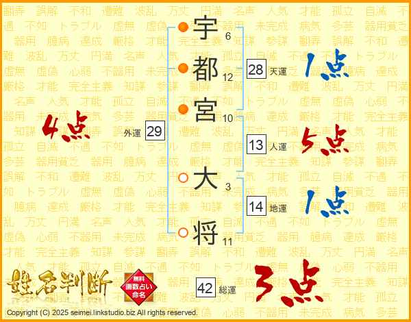 宇(6画)都(12画)宮(10画) 大(3画)将(11画)