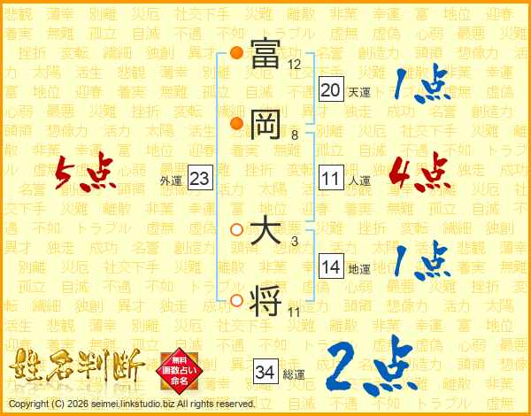あなたの人生を表す1番重要な運勢です。生涯を通じて影響する総合運となり、主に50歳以降の晩年期に影響を及ぼします。苗字と名前の合計画数。