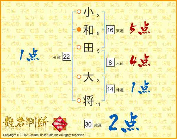 小(3画)和(8画)田(5画) 大(3画)将(11画)