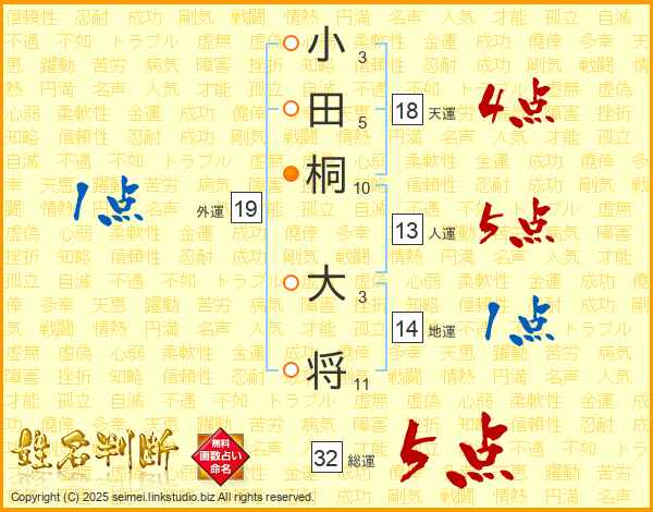 小(3画)田(5画)桐(10画) 大(3画)将(11画)