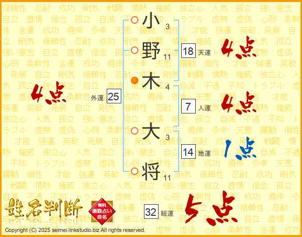 小(3画)野(11画)木(4画) 大(3画)将(11画)