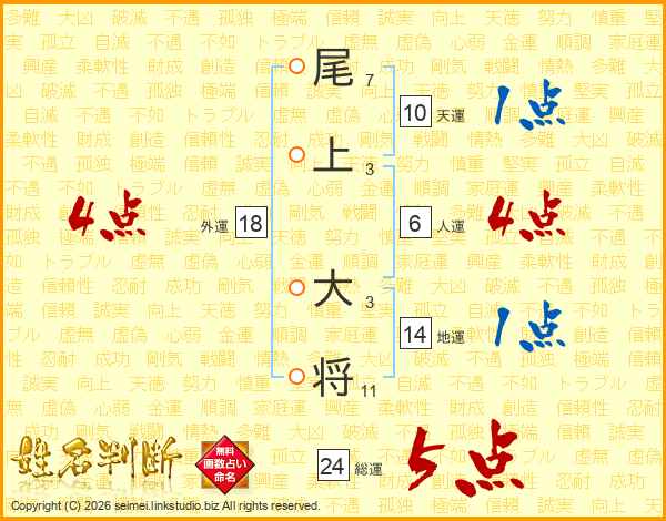 生活面を象徴する運勢です。外部から受ける影響力を表し、結婚運、家庭運や職場、環境への順応性を表します。総運から人運を引いた画数。姓や名が1文字の場合を除く。