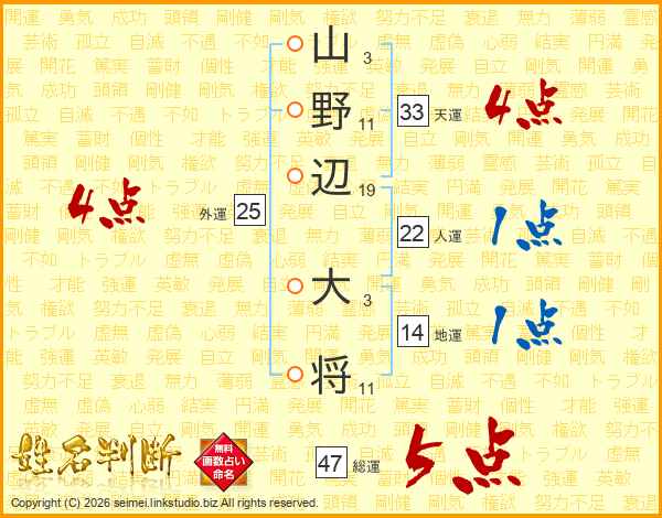 山(3画)野(11画)辺(19画) 大(3画)将(11画)