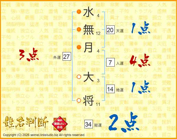 水(4画)無(12画)月(4画) 大(3画)将(11画)