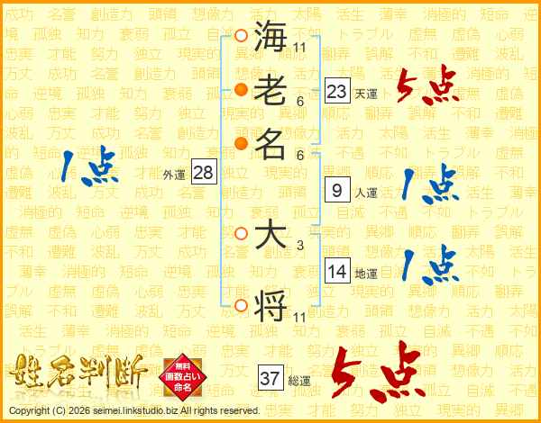 海(11画)老(6画)名(6画) 大(3画)将(11画)