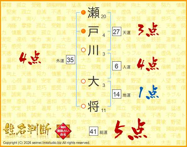 瀬戸川大将さんの総運は41画の5点!