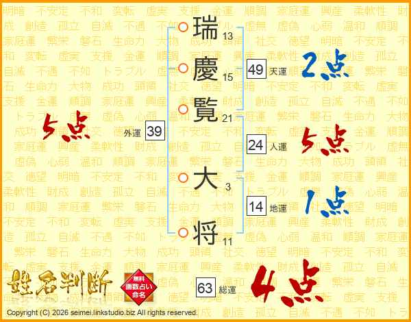 瑞慶覧大将さんの総運は63画の4点!