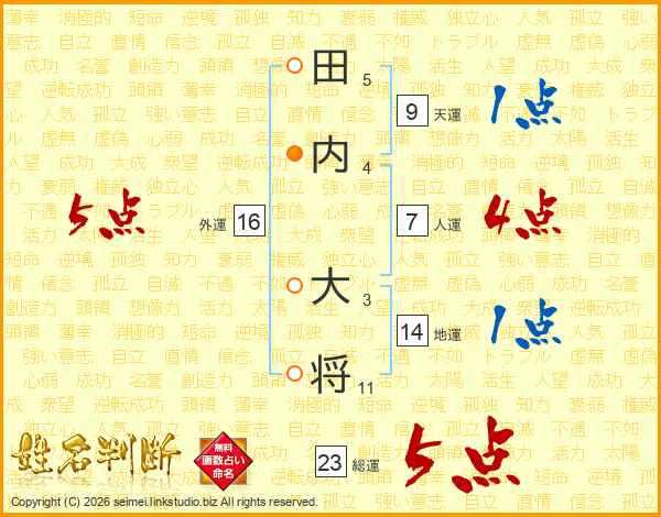 あなたの人生を表す1番重要な運勢です。生涯を通じて影響する総合運となり、主に50歳以降の晩年期に影響を及ぼします。苗字と名前の合計画数。