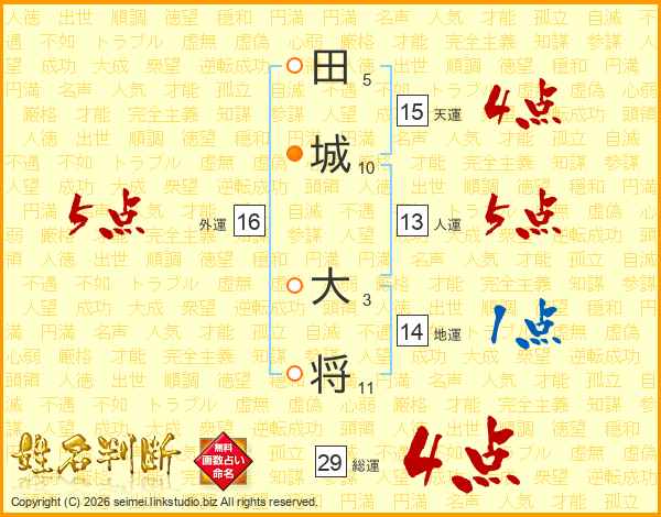 あなたの人生を表す1番重要な運勢です。生涯を通じて影響する総合運となり、主に50歳以降の晩年期に影響を及ぼします。苗字と名前の合計画数。