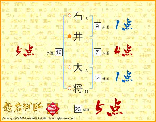 あなたの人生を表す1番重要な運勢です。生涯を通じて影響する総合運となり、主に50歳以降の晩年期に影響を及ぼします。苗字と名前の合計画数。