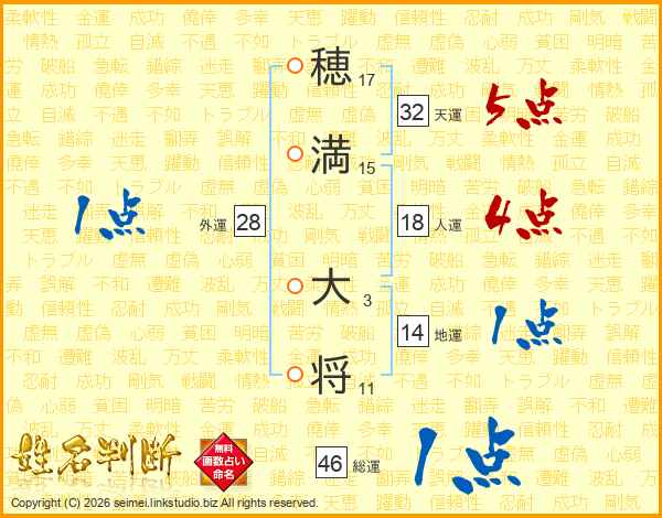 生活面を象徴する運勢です。外部から受ける影響力を表し、結婚運、家庭運や職場、環境への順応性を表します。総運から人運を引いた画数。姓や名が1文字の場合を除く。