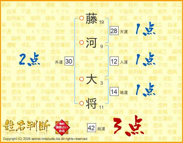 藤(19画)河(9画) 大(3画)将(11画)