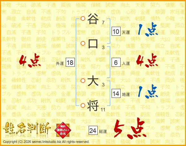 生活面を象徴する運勢です。外部から受ける影響力を表し、結婚運、家庭運や職場、環境への順応性を表します。総運から人運を引いた画数。姓や名が1文字の場合を除く。