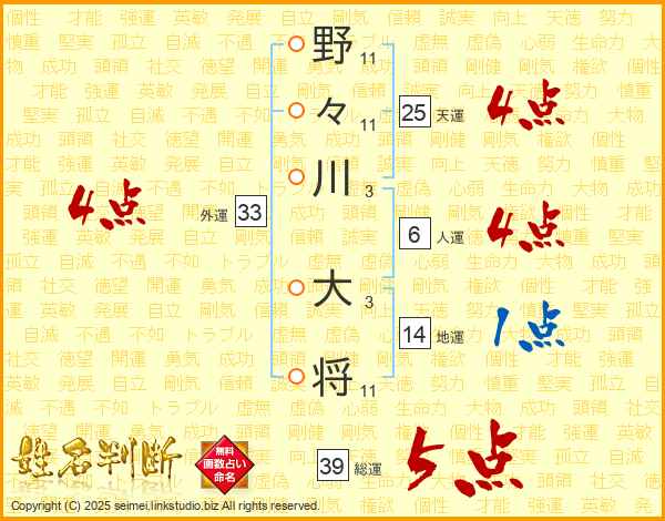 野(11画)々(11画)川(3画) 大(3画)将(11画)