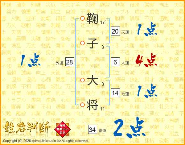 生活面を象徴する運勢です。外部から受ける影響力を表し、結婚運、家庭運や職場、環境への順応性を表します。総運から人運を引いた画数。姓や名が1文字の場合を除く。