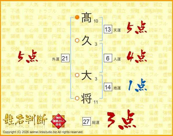 髙(10画)久(3画) 大(3画)将(11画)