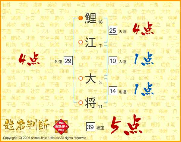 生活面を象徴する運勢です。外部から受ける影響力を表し、結婚運、家庭運や職場、環境への順応性を表します。総運から人運を引いた画数。姓や名が1文字の場合を除く。