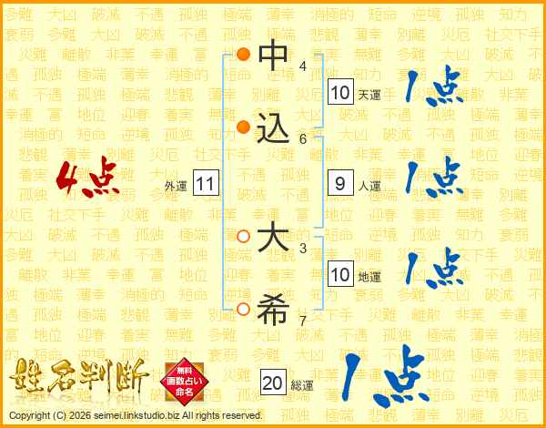 中(4画)込(6画) 大(3画)希(7画)