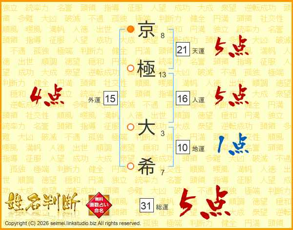 あなたの人生を表す1番重要な運勢です。生涯を通じて影響する総合運となり、主に50歳以降の晩年期に影響を及ぼします。苗字と名前の合計画数。
