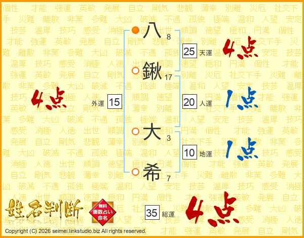 八(8画)鍬(17画) 大(3画)希(7画)